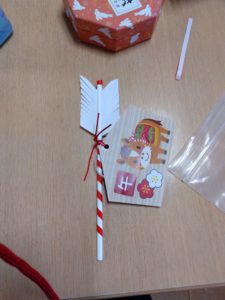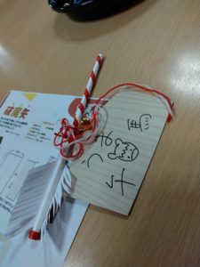 棒の部分はストローなんです。羽の部分が入る位切り込みを入れ、上を固定し羽の部分に切り込みを入れます。皆さん、細かい作業が得意なんですよ😁